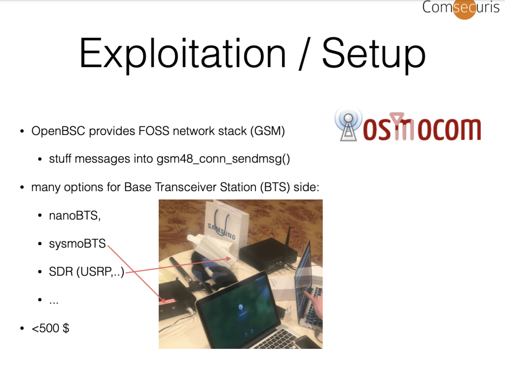 比较经典的一个案例是Amatcama在参加Pwn2own的时候,通过对三星基带固件的逆向分析、漏洞利用,配合开源基站发射加载漏洞利用代码的无线电波,从空中接口利用漏洞,在受害者无任何感知的情况下,远距离对受害者进行攻击。通过软件无线电跟开源基站,在空口实现远程攻击基带,在 Android手机中执行命令、在RFS写入文件。详情可在参考部分找到伟神写的 Mosec 2018 议题解读。