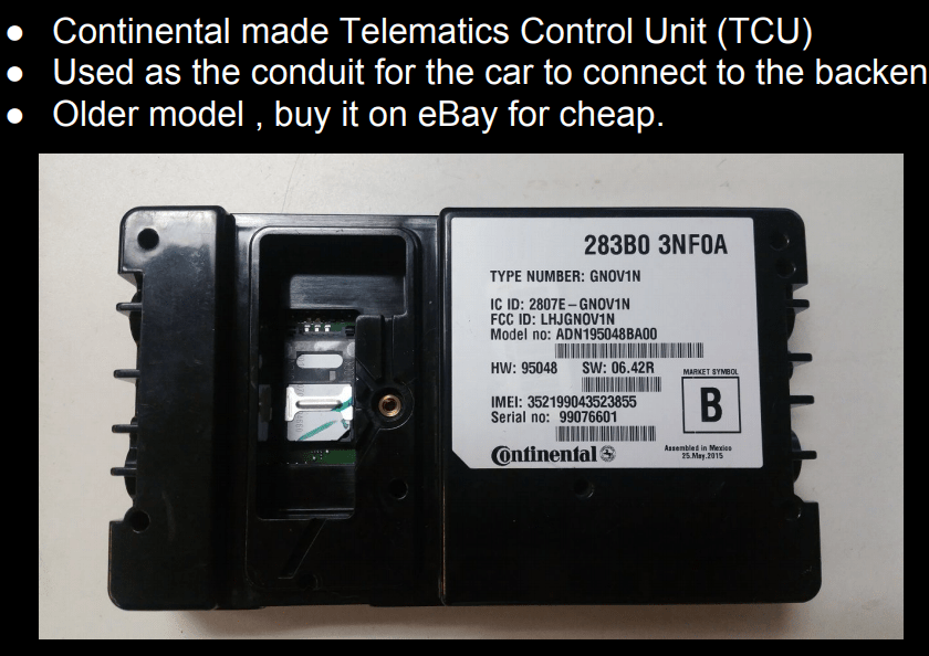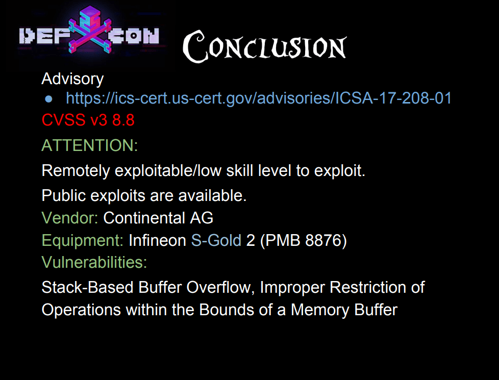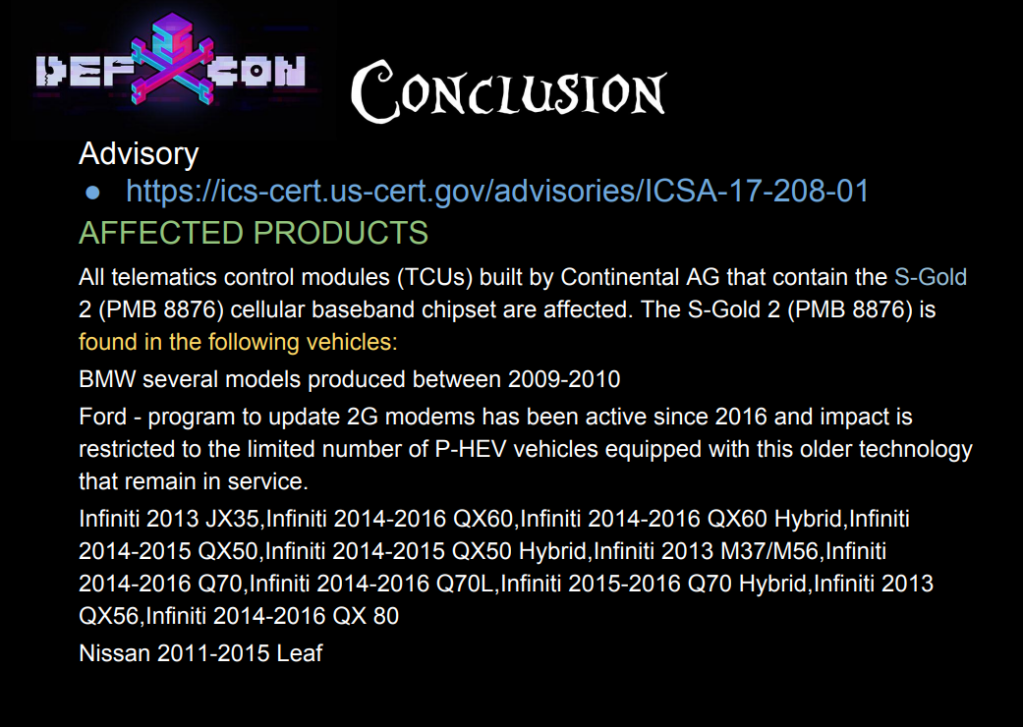 除了上述两个经典案例,在 16 年 17 年的时候就曾爆出:福特、英菲尼迪、日产和宝马旗下部分老车装载的德国英飞凌芯片其调制解调器AT指令集存在安全漏洞,英飞凌2G基带芯片— S-Gold 2(PMB 8876),该零件被上游厂商德国大陆集团用于生产车载信息控制单元(TCU)。