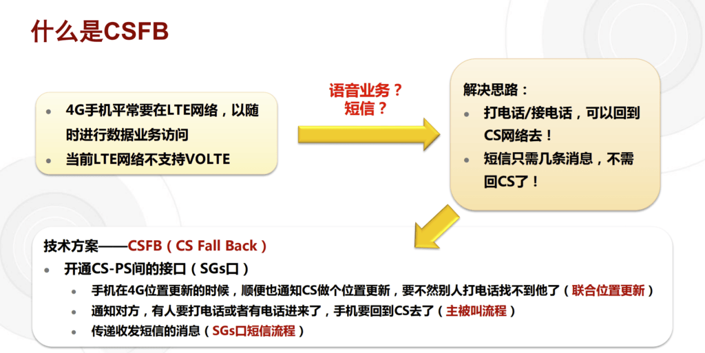 CSFB(Circuit Switched Fallback),电路域回落,顾名思义,就是UE驻留在LTE网络时,当需要完成语音业务时再回落到2G/3G网络的CS域。当在2G/3G网络完成呼叫后,重新返回LTE网络。