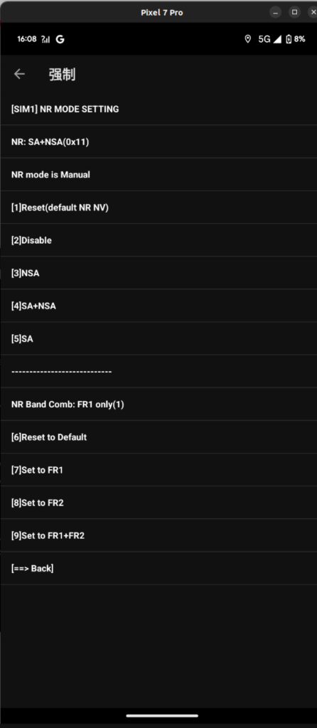 网优软件 信号大师 —> 强制功能 —> SIM 1 —> 3 NR MODE SETTING —> 4 SA+NSA 以及 NR Band 选择 Set To FR1 (FR2 为毫米波频段 大陆地区5G 没用毫米波)