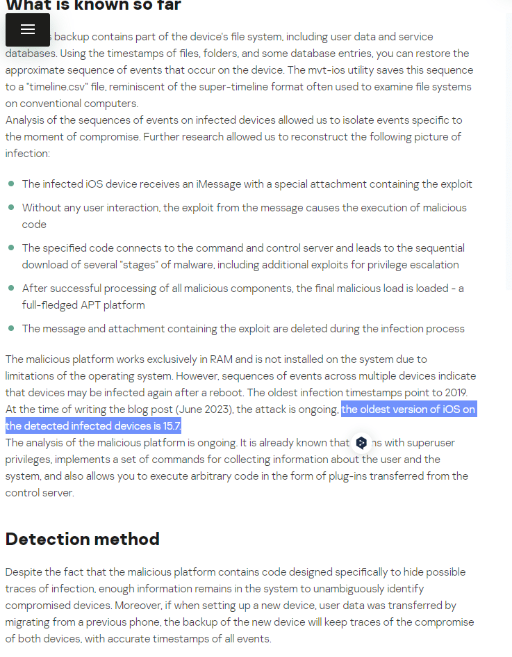 The attack starts with iMessage with a malicious attachment, which, using a number of vulnerabilities in iOS installs spyware. No user action is required.#IOSTriangulationpic.twitter.com/daxEYZwXwD