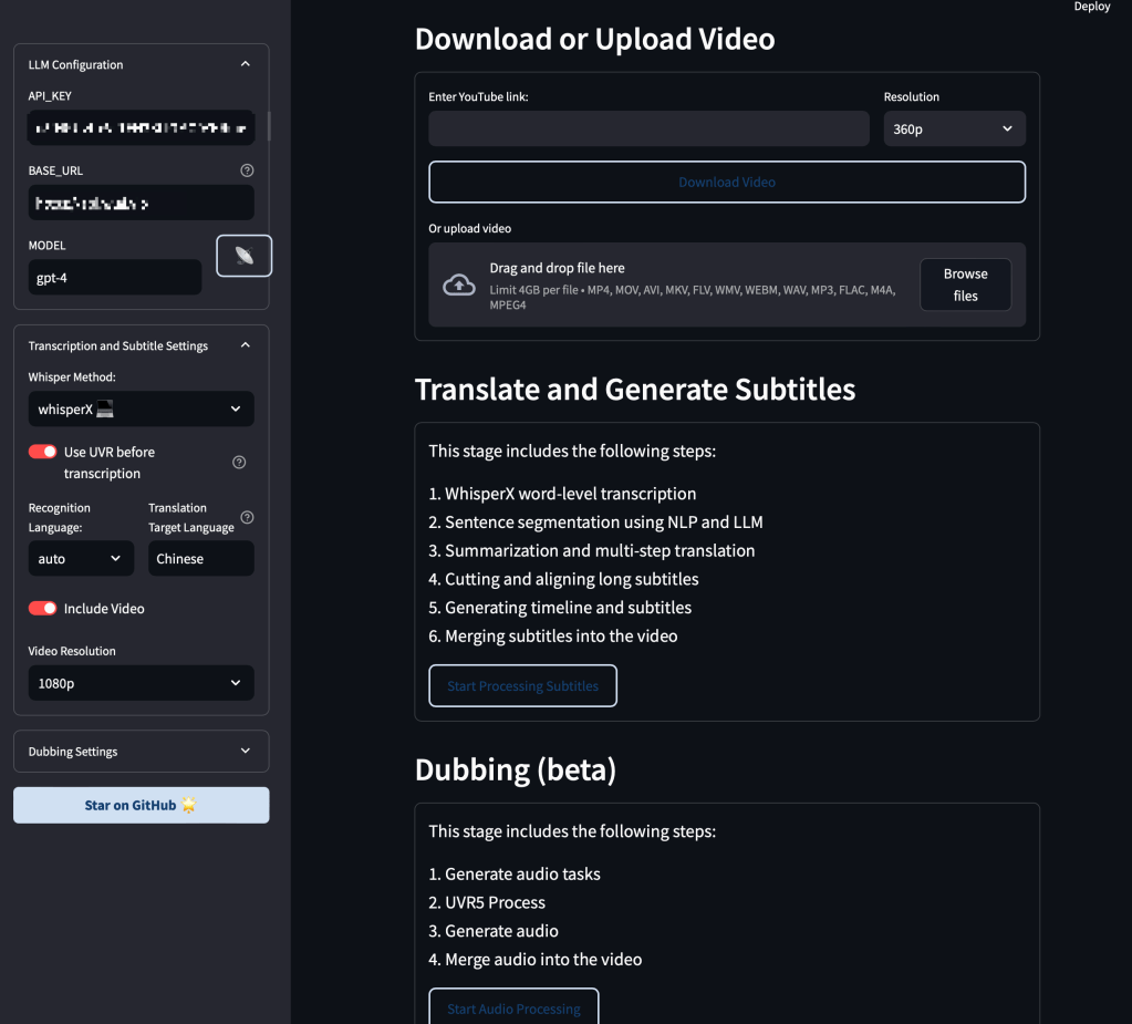 工具借助了FFmpeg,从视频中提取音频,再通过AI将音频转成文本并翻译、合并成字幕,全程自动化无需人工介入参与,只需要配置AI平台API Key,极大地提高了翻译准确率,同时也很大程度上降低了学习国外资料的门槛,我个人很喜欢用它来翻译国外的视频资料。
