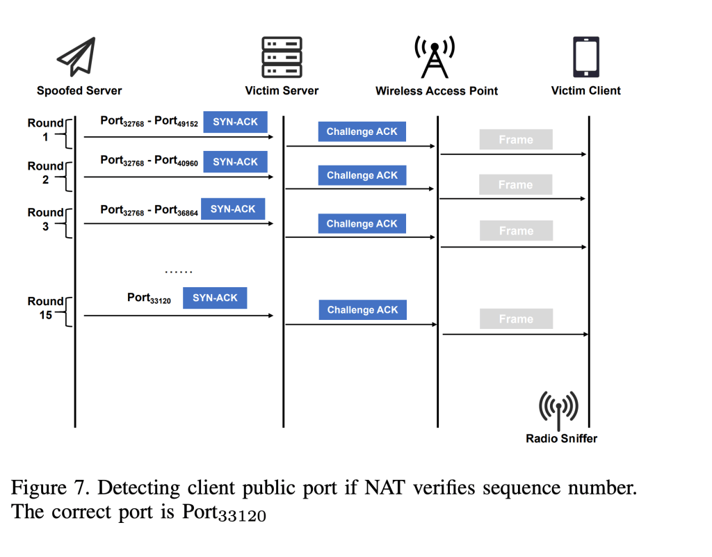 公式 (3) 和 (4) 描述了如何确定 B 和每个 BIN 中端口的数量 b,以在合理时间内完成端口推断。例如,在 5Mbps 带宽下,可以将 2^16 个端口划分为 64 个 BINs,每个 BIN 包含 512 个端口,可以在几秒内完成。应对 NAT 验证序列号的情况: 对于一些会验证序列号的 NAT,攻击者可以伪造 SYN-ACK 数据包,并利用Challenge ACK确认来推断四元组(如论文图 7 所示),这种方法更为隐蔽。