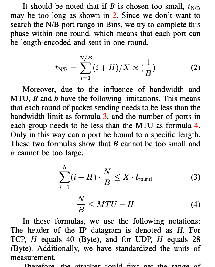 考虑 MTU 和带宽: 直接为每个端口分配独特长度不可行。论文提出将端口搜索空间划分为多个“BIN”(桶),每个 BIN 包含一定数量的端口,并为每个 BIN 分配一个数据包长度。攻击者先确定哪个 BIN 包含目标端口,再在该 BIN 内进行更精细的查找。