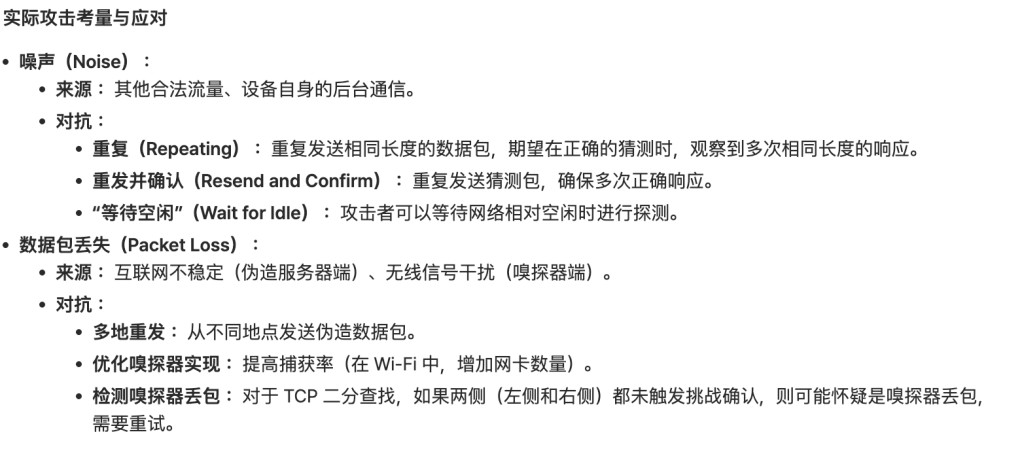 局限性(对抗块密码): 如果网络使用块密码(Block Cipher)并且进行了填充(padding),那么密文长度与明文长度的直接关系就不那么精确了,会增加侧信道的噪声,使攻击难度增大(这一点在论文的讨论部分有所提及)。