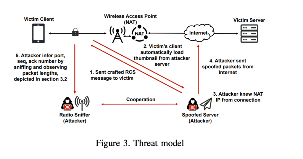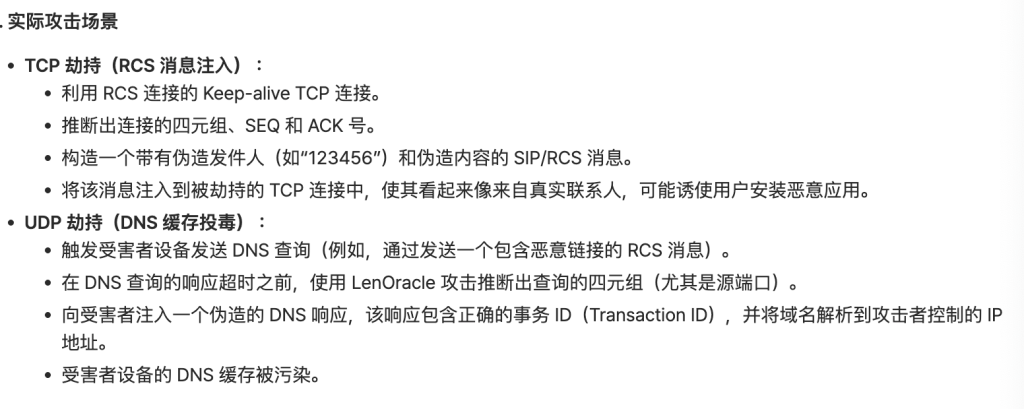 利用应用层特性: 例如,通过发送一个包含 attacker IP 地址的 RCS 消息,诱导受害者客户端自动加载缩略图,从而向攻击者服务器发送请求,暴露其公网 IP。