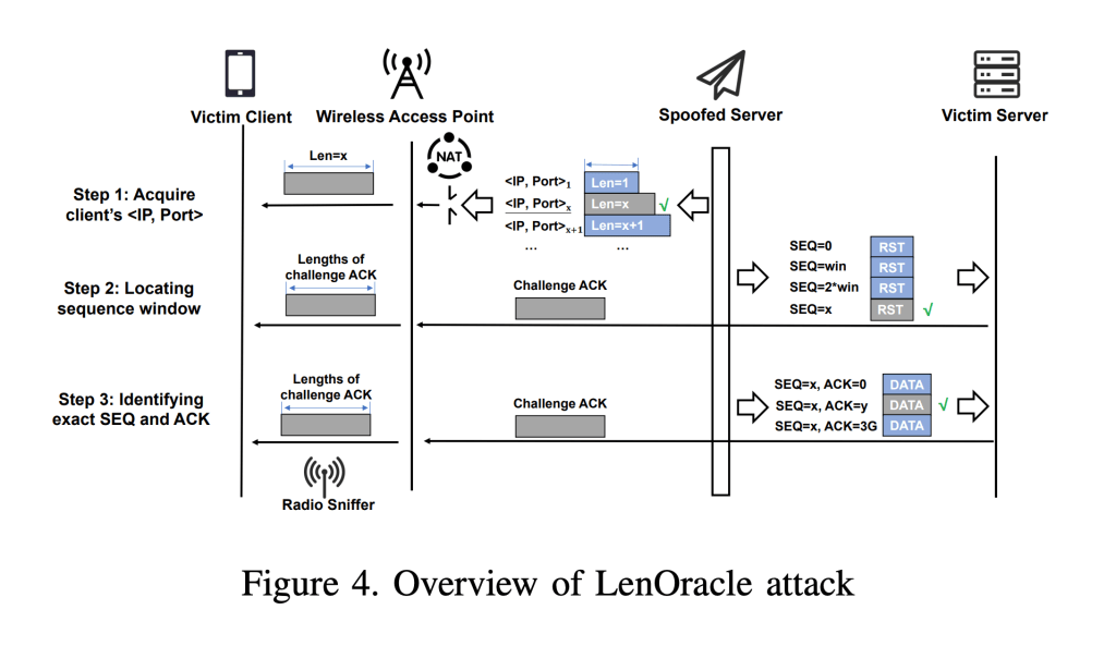 LenOracle 攻击的核心在于利用无线网络中因使用流密码而产生的数据包长度侧信道,并结合 TCP/IP 协议和 NAT 的特性,来逐步推断出目标 TCP/IP 连接的关键信息(四元组、序列号、确认号),最终实现连接劫持。